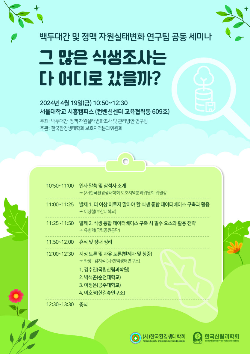 이 세미나는 그동안 우리나라에서 시행된 수많은 식생조사의 원데이터가 DB로 구축되지 못하고 사라져가는 현상을 개선하고자 추진된 세미나입니다.