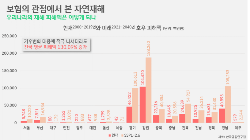 그런데, 한국금융연구원에 따르면, 우리가 아무리 잘 대응하더라도 2040년까지 전국의 호우 피애액은 2000~2009년 대비 130% 이상 증가한다고 합니다.